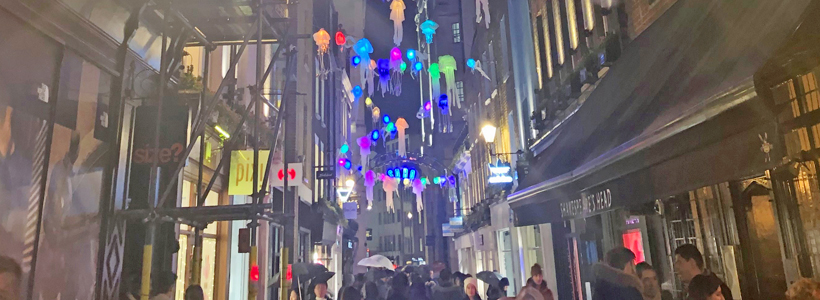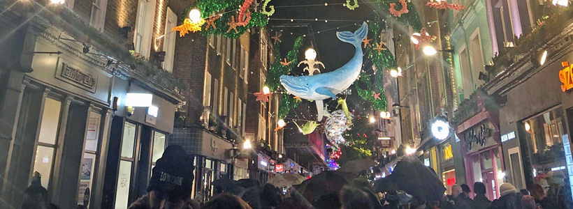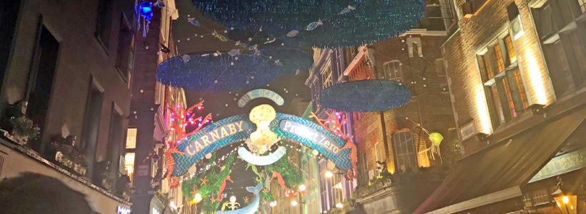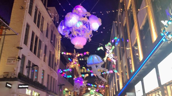 Τα φώτα άναψαν και φέτος στο εορταστικό Λονδίνο. Λίγο νωρίς για τα ελληνικά δεδομένα αλλά εδώ η εορταστική διάθεση πάει ασορτί με το τσουχτερό κρύο! Ξεχωρίζει η πρωτοβουλία της Carnaby Street να χρησιμοποιήσει ανακυκλωμένους και ανακυκλώσιμους στολισμούς. Η εναλλακτική και πάντα γεμάτη τουρίστες Λονδρέζικη οδός, όπου μερικοί από τους πιο υπερ-μοντέρνους σχεδιαστές μόδας επιδεικνύουν τη δουλειά τους και τα μαγαζιά κοσμούν πόστερ Βρετανών μουσικών γιγάντων, από τον Bowie και τους Beatles μέχρι τους αδρεφούς Gallagher, διάλεξε φέτος την περιβαλλοντική ευαισθητοποίηση.