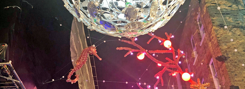 Ο στολισμός έγινε σε συνεργασία με το Porject Zero, τον ΜΚΟ που επικέντρωνεται στη συντήρηση της θαλάσσιας ζωής. Κοράλλια, φάλαινες, θαλάσσιες χελώνες και μέδουσες κολυμπάνε στο λονδρέζικο αέρα προσπαθώντας να περάσουν το μήνυμά τους: η θαλάσσια ζωή απειλείται όσο ποτέ άλλοτε από την κλιματική αλλαγή-κρίση.