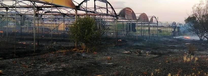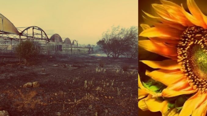 Η φωτιά ήλθε αστραπιαία, από βόρεια, δίπλα από καταυλισμό ρομά, πιθανόν από καμίνι καλωδίων για εξαγωγή χαλκού, με βόρειο άνεμο και μέσα σε λιγότερο από τρία λεπτά έκαψε 3,5 στρέμματα θερμοκήπια, από νάιλον & από πολυκαρβονικό. Η μεγάλη όμως ζημιά είναι στην επένδυση, δηλαδή τόσο στα θερμοκήπια, όσο και στα πλαστικά συστήματα άρδευσης, στους αυτόματους μηχανισμούς ανοίγματος και κλεισίματος, στον φωτισμό και λαμπτήρες, στις καλωδιώσεις και τους ανεμιστήρες και τις βοηθητικές εγκαταστάσεις. Από τις αναρτήσεις του στο facebook (Giorgos Poniros) βλέπουμε το καινούργιο ξεκίνημα του Γιώργου μόλις ένα μήνα πριν είχε που είχε ξαναφυτεύσει ήλιους (εν μέσω πανδημίας, 21/5/2020), ανακαίνισε τα θερμοκήπια και έβαλε το ειδικό αντιηλιακό επίστρωμα και στις 5/7/2020 βλέπουμε πάλι από φωτογραφίες στο facebook την περήφανη νέα παραγωγή ηλίανθων και αγριοαγγιναρών στην Κεντρική Ανθαγορά Αθηνών (Ανθέων 21, Άνω Πατήσια).