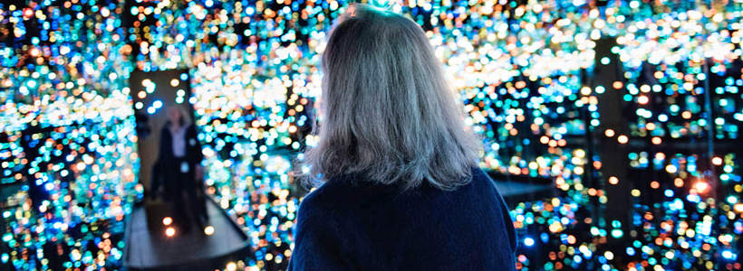 With LOVE IS CALLING, Kusama offers visitors the opportunity to experience her notion of the infinite. As visitors walk throughout the installation, a sound recording of Kusama reciting a love poem in Japanese plays continuously. Written by the artist, the poem’s title translates to Residing in a Castle of Shed Tears in English. Exploring enduring themes including life and death, the poem poignantly expresses Kusama’s hope to spread a universal message of love through her art.